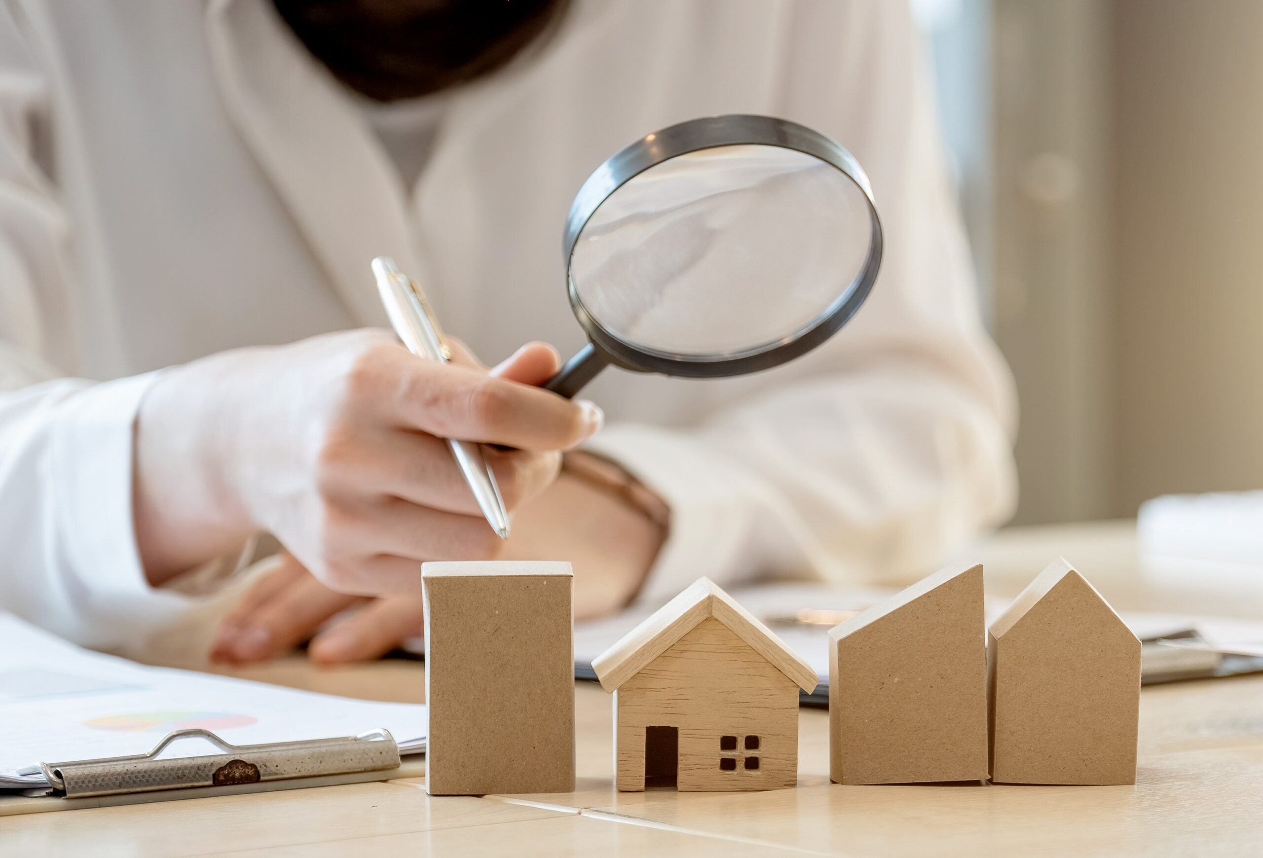 person looking through a magnifying lens at a group of wooden block toy homes as featured image for article by kelley way titles estate planning myths